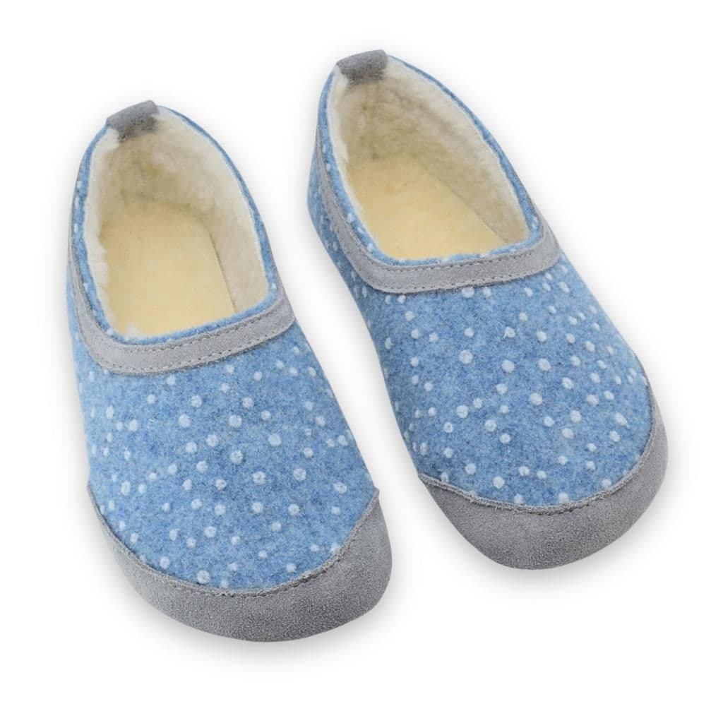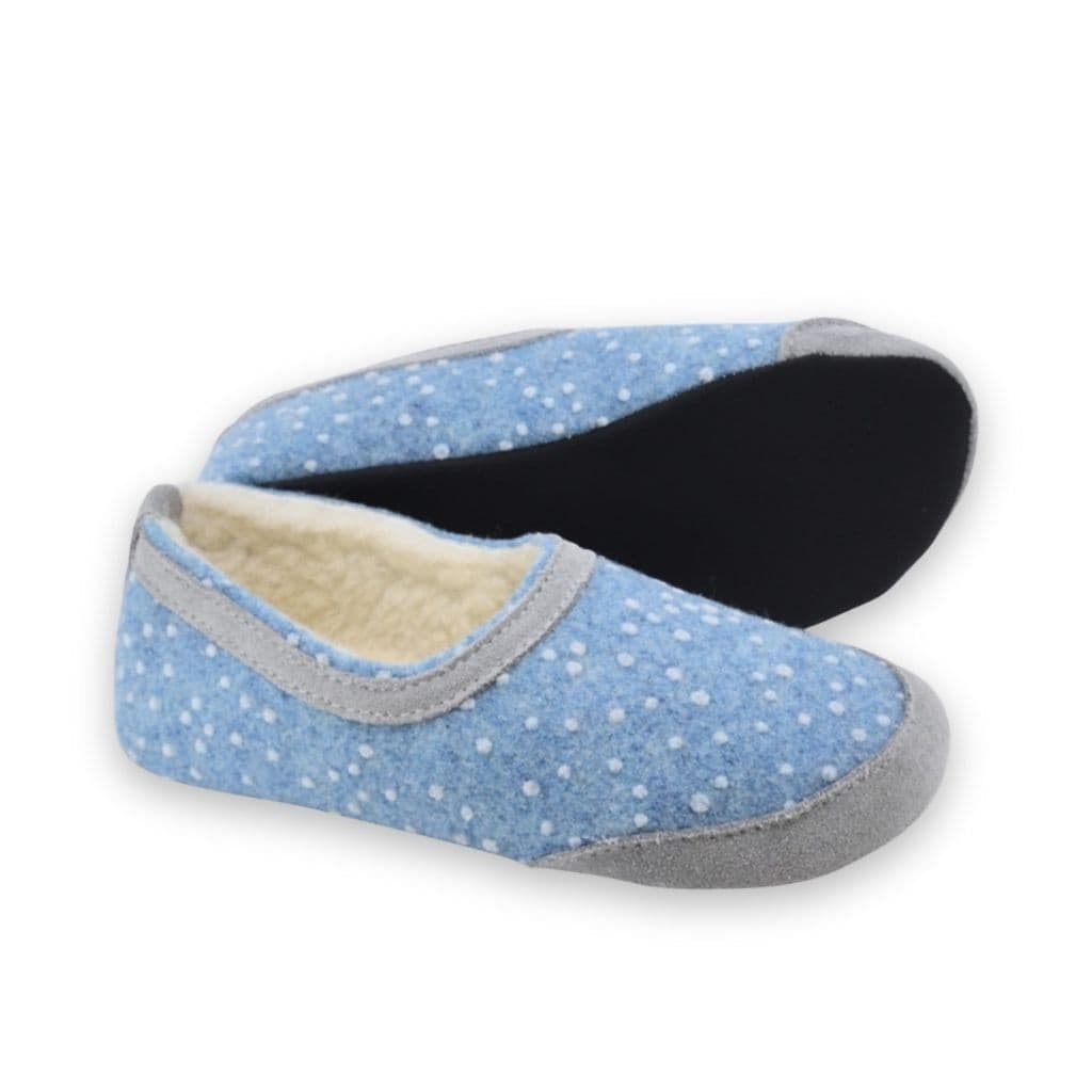 Keep your little one’s feet warm and cosy indoors with these charming barefoot wool slippers, lined with soft 100% lambswool for extra comfort on chilly days. Designed in a light blue shade with a playful spotty pattern, they are made from natural wool-blend felt and finished with a thin PU-coated microfibre sole that provides excellent flexibility and a lightly grippy, rubber-like feel, ideal for safe, comfortable indoor wear.