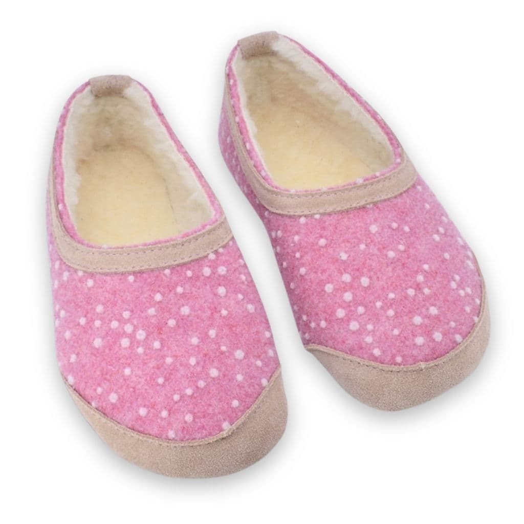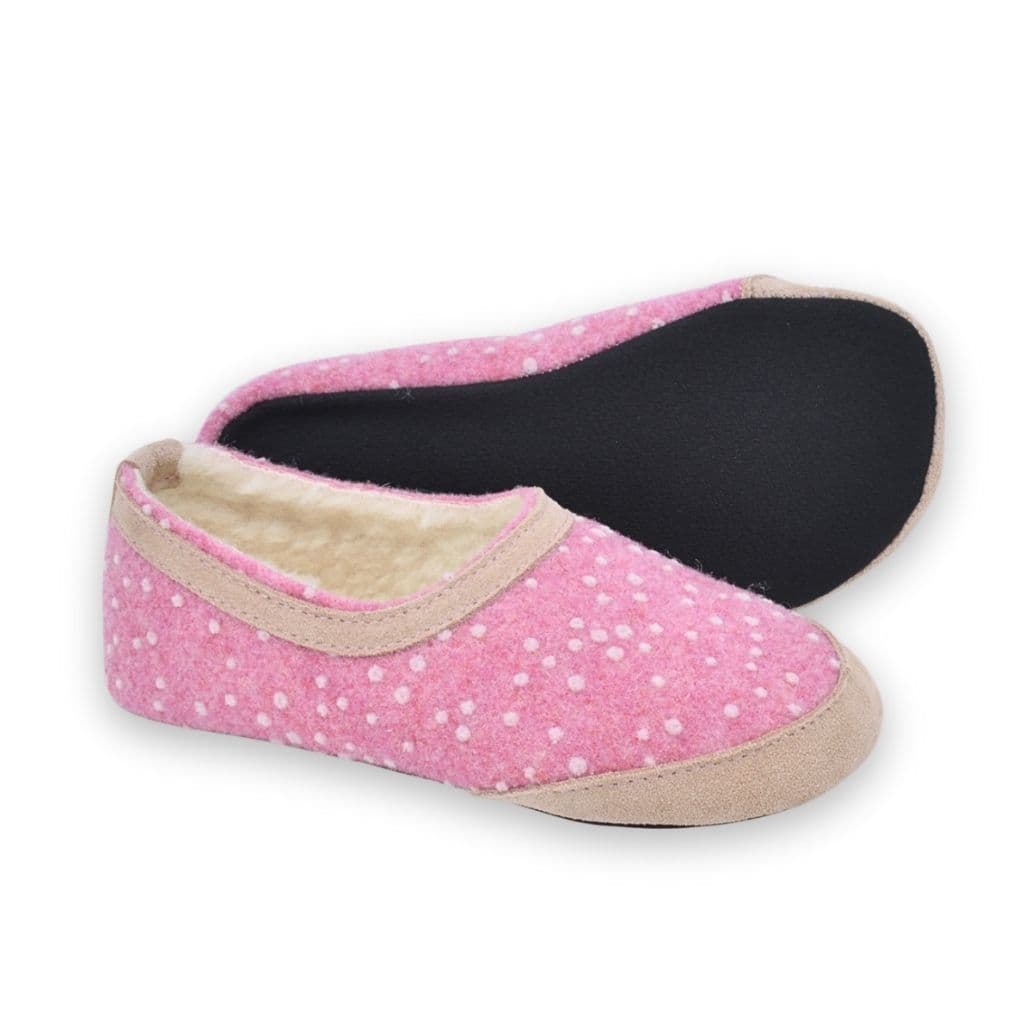 Keep your little one’s feet warm and cosy indoors with these charming barefoot wool slippers, lined with soft 100% lambswool for extra comfort on chilly days. Designed in a sweet pink shade with a playful spotty pattern, they are made from natural wool-blend felt and finished with a thin PU-coated microfibre sole that provides excellent flexibility and a lightly grippy, rubber-like feel, ideal for safe, comfortable indoor wear.