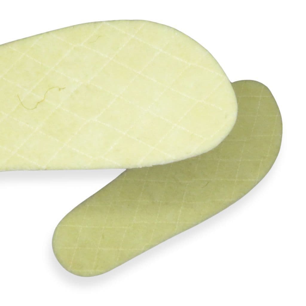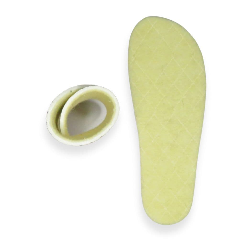 Warm insoles for barefoot shoes with a wool felt upper, foam insulating mid-layer and aluminium foil backing