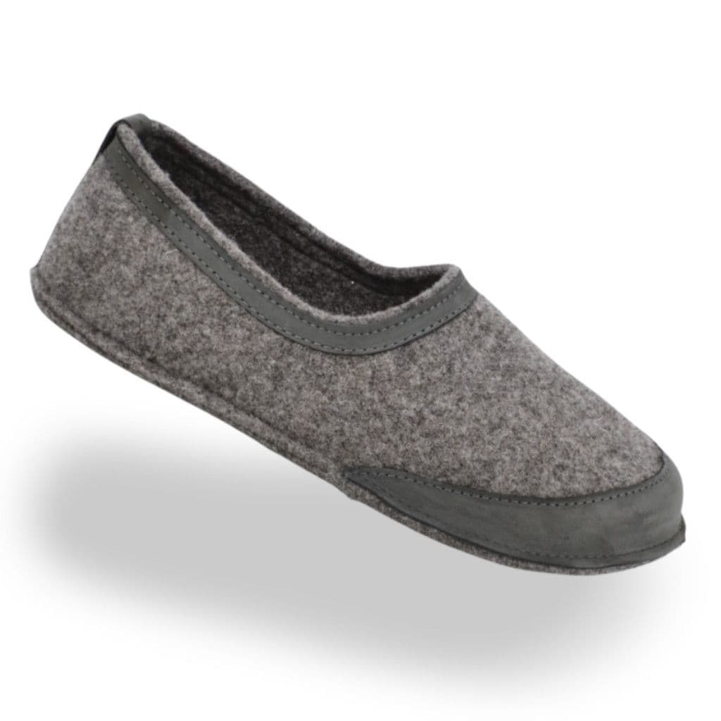 Keep your feet warm and cozy indoors with the Omaking barefoot slippers! Made from natural wool blend felt in dark ash brown colour and finished with a thin, soft rubber sole for ultimate flexibility. Grey velour leather details reinforce the slipper's high-wear areas while adding a stylish touch. With a minimalistic design, these lightweight slippers are universally suitable for any gender.